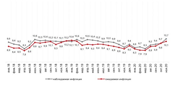 Уровень наблюдаемой гражданами инфляции на середину ноября в 2,5 раза превысил официальную цифру от Росстата и достиг 10,7% — максимума с октября 2017 года.