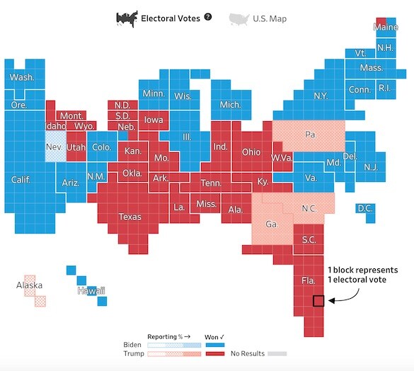 По данным на 15.00 мск четверга, Байден выигрывает выборы в 22 штатах и федеральном округе Колумбия, получая 264 голоса выборщиков из необходимых 270.