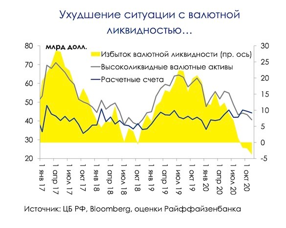 Этот разрыв банки компенсировали за счет собственных запасов валюты, накопленных на корсчетах за рубежом. В октябре оттуда было выведено 2,7 млрд долларов.
