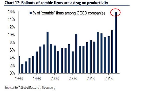 «Зомби-компании» — детище стимулирующих мер на сумму 21 трлн долларов, которые правительства и центробанки запустили в ответ на пандемию: эти вливания «были необходимы», но побочным эффектом является то, что слабые компании спасаются вместе с сильными, объясняет Bank of America.