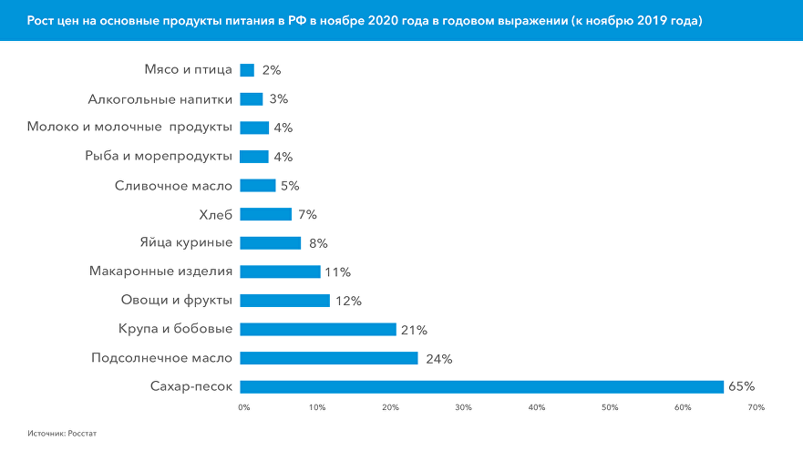 График. Рост цен на основные продукты питания в РФ в ноябре 2020 года в годовом выражении (к ноябрю 2019 года)
