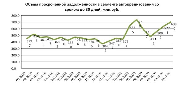 Объем просроченных платежей по автокредитам растет четвертый месяц подряд и по итогам октября вышел на уровни, которые наблюдались на «дне» экономического спада в апреле и мае.