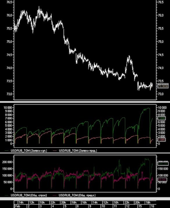 На торгах в понедельник, 15 февраля, общее число заявок на приобретение долларов с расчетом «завтра» достигало почти 10 тысяч и обновило абсолютный рекорд за все время биржевой статистики.