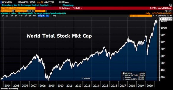 Банки, хедж-фонды и частные трейдеры продолжают дружно жать на кнопки buy под шум «печатных станков» мировых ЦБ, закачавших в систему 10 трлн долларов денежной эмиссии. Цунами ликвидности подбросило вдвое капитализацию глобальных фондовых бирж: пробив отметку 112 трлн долларов, она на четверть превышает глобальный ВВП.
