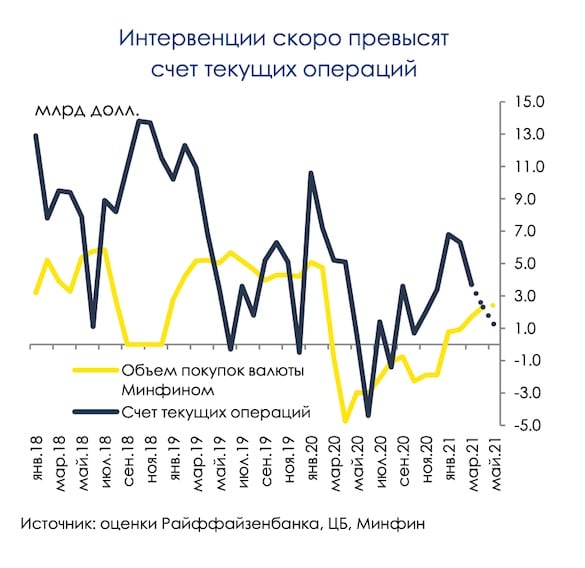 Уже в апреле объем интервенций фактически сравнялся с сальдо платежного баланса — Минфин купил 2,4 млрд долларов, а экономика «заработала» около 2,3 млрд, оценивает аналитик Райффайзенбанка Статислав Мурашов.