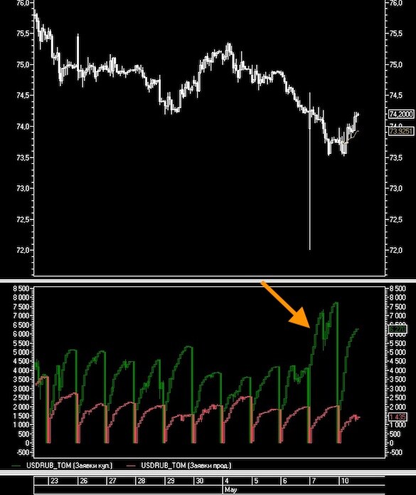 Число продавцов в паре доллар-рубль с расчетами «завтра» напротив снизилось более чем вдвое: пока курс держался выше 75 заявок на продажу было больше 3 тысяч в течение дня, теперь же — меньше 1,5 тысячи.
