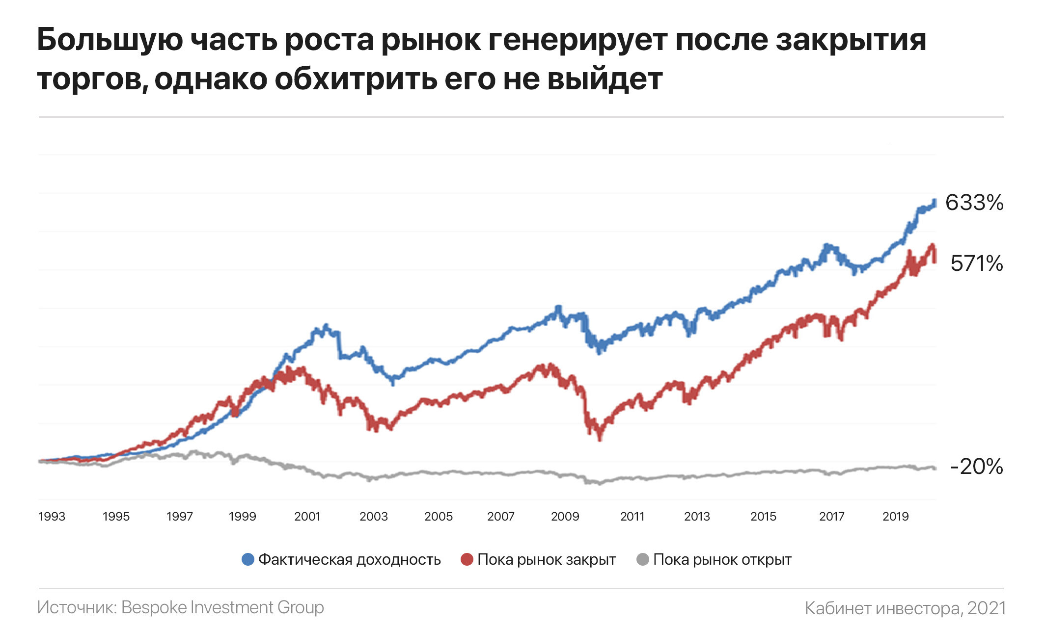 Суть стратегии проста как 5 копеек: покупка американского фондового рынка (через SPY) за секунду до закрытия и его обратная продажа в первую секунду открытия торгов на следующий день. При условии ежедневного совершения этой нехитрой операции, доходность стратегии за период с 1993 по февраль 2020 гг. составила 571% без учета реинвестирования дивидендов.