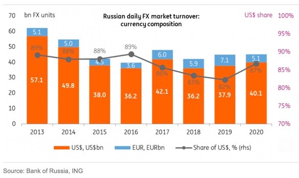 Долю внешних займов в долларах за 7 лет удалось сократить с почти половины до 37%, а доля доллара в торговле сырьем, достигавшая 80%, к концу 2020 года упал ниже 50% впервые в современной истории.