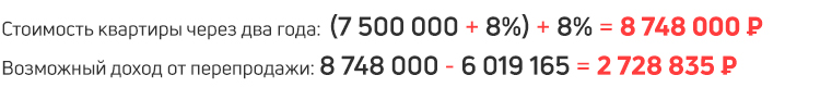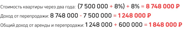 А теперь предположим, что текущая динамика цен сохранится и квартиры в Подмосковье будут дорожать на 8% в год. Посчитаем, сколько можно заработать через два года без учёта инфляции и налогов (для упрощения не стал их использовать в расчётах, но помните — что они ещё смогут снизить доходность):