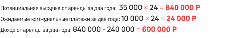 Без учёта налогов, инфляции, коммунальных платежей (по договорённости их можно возложить на арендаторов), расходов на обустройство и ремонт, доходность за 2 года будет равна: