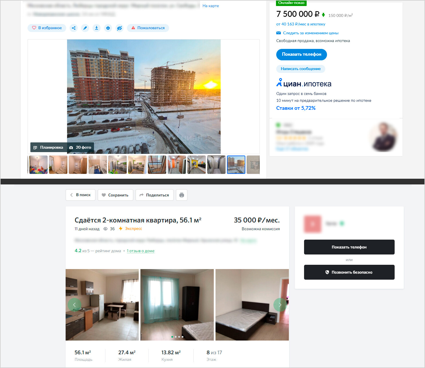 Сопоставление стоимости готовой квартиры и арендных платежей в соседних домах на Циане