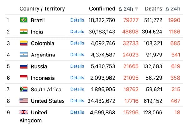 Россия находится на 5-месте в мире по числу заражений Covid-19, уступая Бразилии (79277 за минувшие сутки), Индии (48698), Колумбии (32733) и Аргентине (24023).
