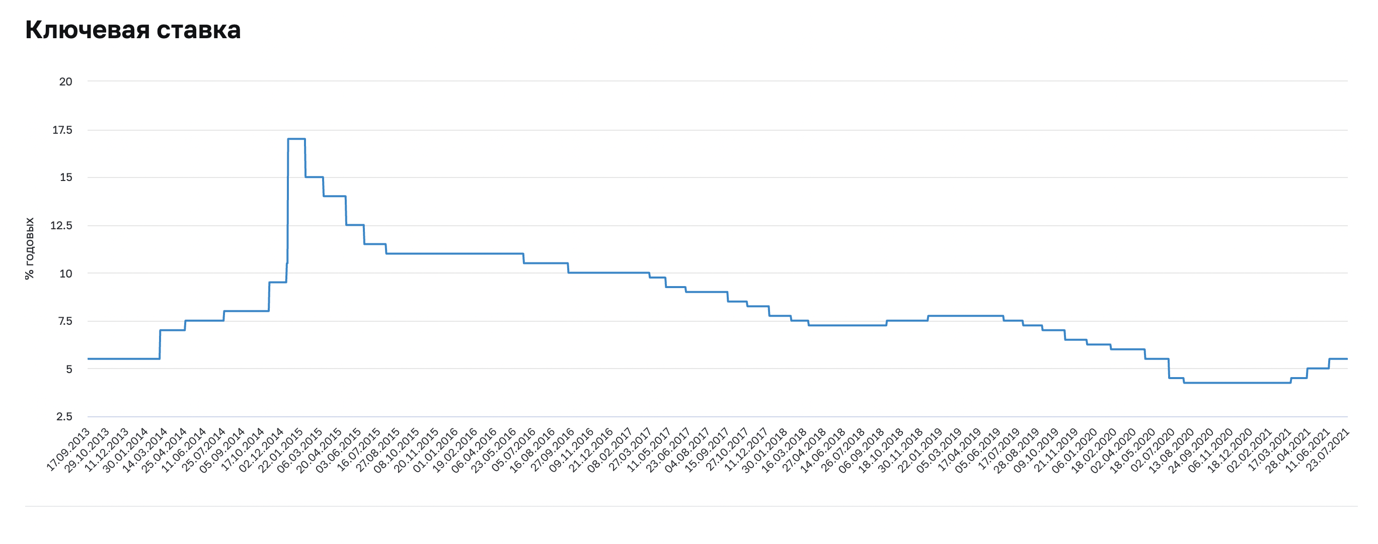 Динамика ключевой ставки с сентября 2013 года по июль 2021 года