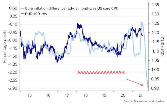 Сильному доллару в ближайшее время будет способствовать разница между базовой инфляцией в ЕС и США, отмечает стратег Nordea Андреас Стено Ларсен.