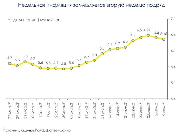 По итогам недели впервые в этом году Росстат зафиксировал дефляцию, а годовой уровень инфляции отступил от пиков вторую неделю подряд — с 6,58 до 6,46%.