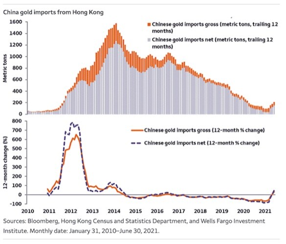 «За последние три месяца импорт золота из Гонконга в материковый Китай подскочил с 38 тонн в месяц до 154 тонн», — указывает руководитель отдела стратегии Wells Fargo Джон Лафорж.