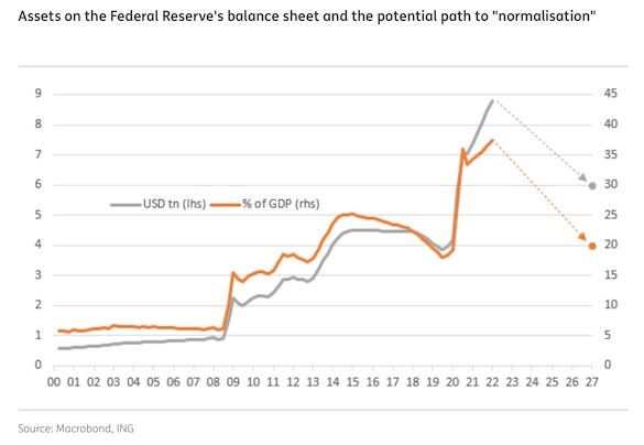 Впрочем, начать ФРС может со скромных операций на сумму до 20 млрд долларов в месяц, а затем довести ее до 90 млрд, прогнозирует ING. По его оценке, баланс ФРС уменьшится до 6 триллионов долларов к середине 2020х и будет равен 20% американского ВВП (против 36% ВВП сейчас).