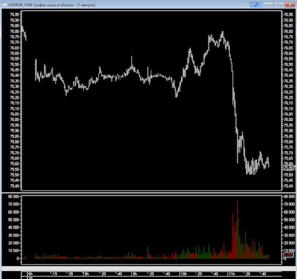 Курс доллара с расчетами «завтра» спикировал на 1,3 рубля за полчаса ушел ниже отметки 76 после того, официальный представитель Минобороны Игорь Конашенков сообщил о завершении «мероприятий боевой подготовки» и возвращении солдат в казармы.