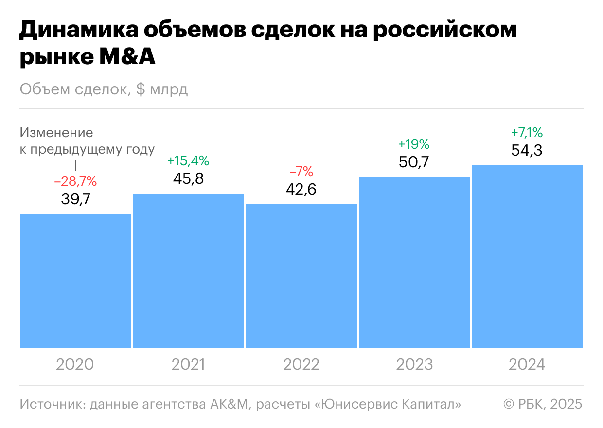 За первое полугодие 2025 года объем сделок M&A на российском рынке составил $18,67 млрд или ₽1,55 трлн, падение на 8% к аналогичному периоду прошлого года. При этом наблюдается существенный рост во втором квартале 2025 года — на 54% относительно января — марта, с $7,3 млрд до $11,3 млрд, под влиянием смягчения денежно-кредитной политики ЦБ.
