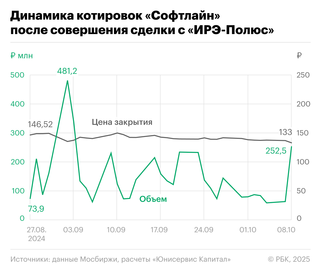 Сама новость о слиянии не привела к росту котировок «Софтлайн»: к концу сентября 2024 года акции просели на 4% относительно начала месяца и составили ₽140, волатильность за месяц составила 6%.