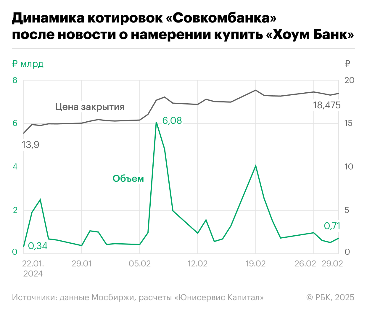 ПАО «Совкомбанк» демонстрирует пример стратегического развития за счет M&A, что подтверждается успешной интеграцией приобретенных активов. В 2023 году была приобретена страховая компания «Инлайф», а 16 февраля 2024 года объявлено о намерении приобрести «Хоум Банк». В этот день, объем торгов вырос почти в два раза и рост продолжился в следующий день торгов достигнув ₽4 млрд, 19 февраля цена достигла самой высокой позиции за месяц ₽18,85 за акцию (+21,5% к началу месяца). На успех во многом повлияла публикация информации о рекордной прибыли по итогу 2023 года.