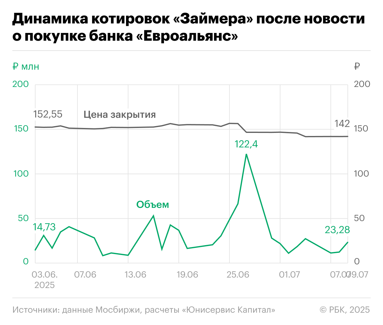 Реакция рынка на приобретение «Займером» банка «Евроальянс» за ₽490 млн 27 июня 2025 года оказалась негативной. Акции компании упали на 6% в день объявления, а к 8 июля снижение достигло 9%, или 40% от цены IPO. В то же время, обороты торгов резко возросли, почти в два раза, и достигли своего максимума в этом месяце ₽122 млн, что говорит об активизации участников рынка.